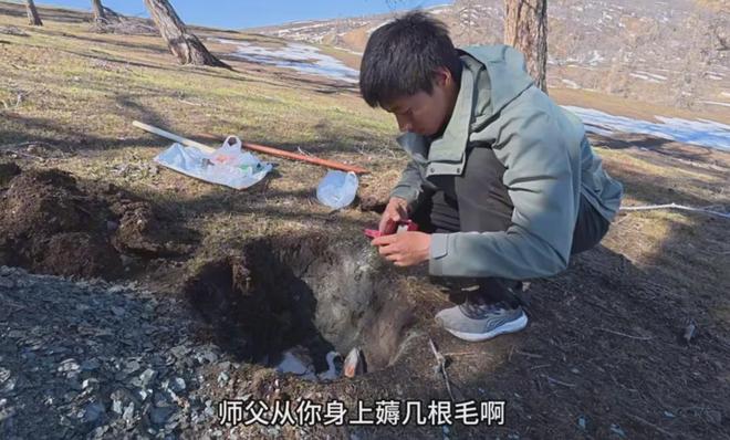 四月底的阿勒泰,山坡上的雪尚未完全融化,碧蓝的天空下,悟空就此在白雪和黑土交融的幽静山坡上长眠。师傅赵朔为他准备了鱼和虾,还有一朵紫色的美丽小花。